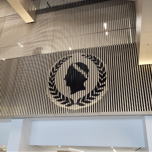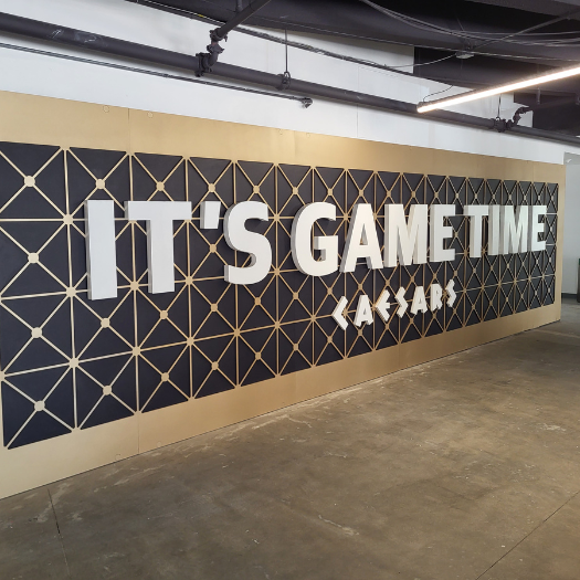 To fabricate the standalone Caesars medallion featured in the new atrium wall, our team used custom polymer tubing with fitted compression collars—an approach that maintained the logo’s clean silhouette while allowing visibility through and around the design. The CCI-provided vinyl graphics were applied directly atop the sealed tubing, which was installed using a scissor lift to ensure exact placement. The result: a dimensional, durable brand feature that feels integrated and intentional in the flowing architecture of the space. We also fabricated HDU letters for the “Your Legacy Starts Here” signage, installing the text with long-term wear in mind. For two other brand statements—“It’s Game Time” and “Domefield Advantage”—we created the intricate CNC-cut aluminum filigree backdrops, which add a sense of energy and style while allowing light and shadow to play across the wall. Though our role varied piece by piece, we installed each signage element across all three locations, ensuring consistency, safety, and craftsmanship throughout the build.