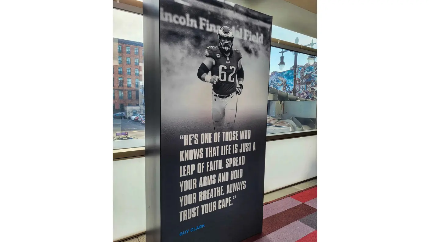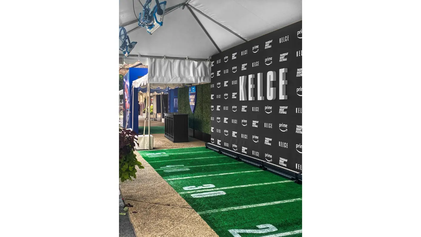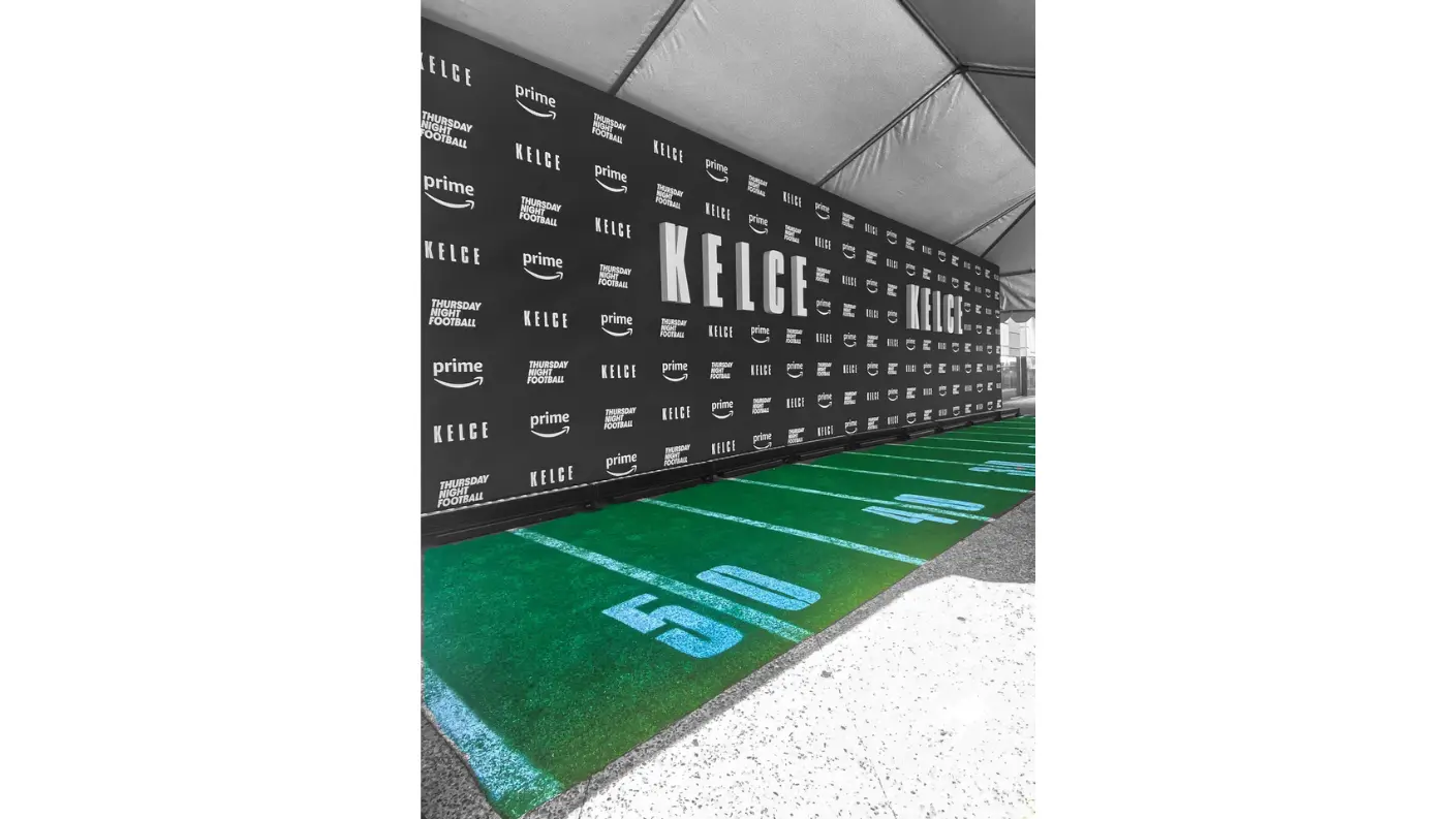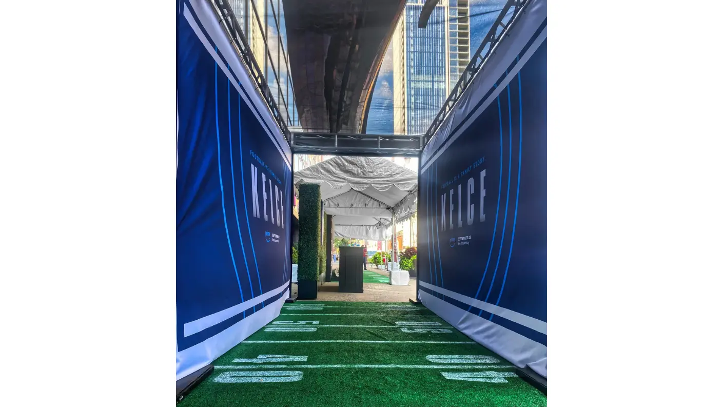 For the world premiere of KELCE—Amazon Prime’s documentary on beloved Eagles icon Jason Kelce—at the Suzanne Roberts Theatre in Philadelphia, we teamed up with our friends at FlyteVu to bring the story to life beyond the screen. Working under a tight timeline, we built, trucked, and installed branded decor that honored Kelce’s grit and hometown pride.