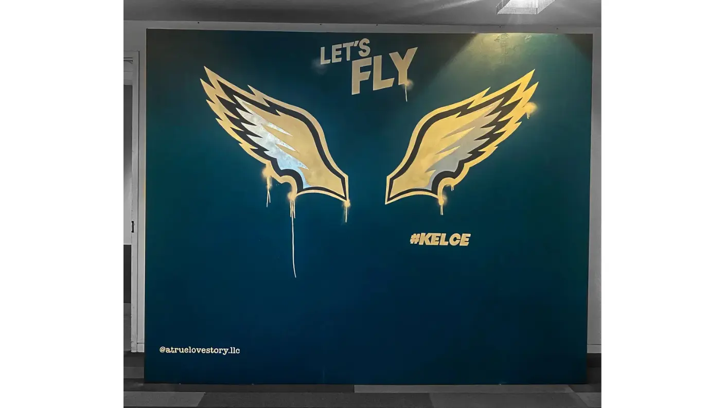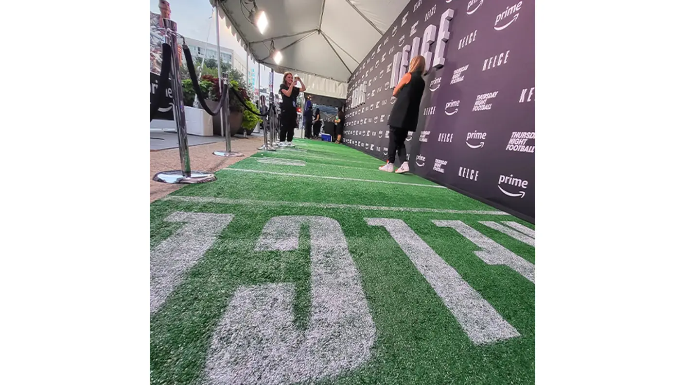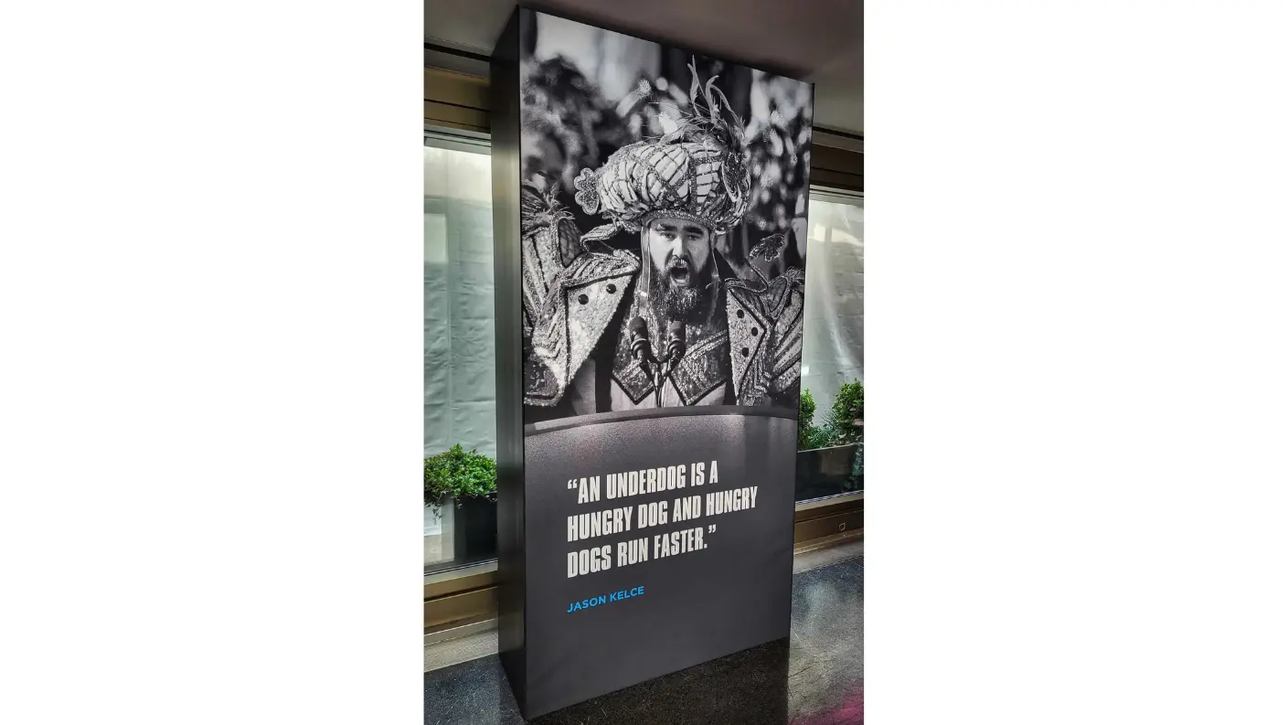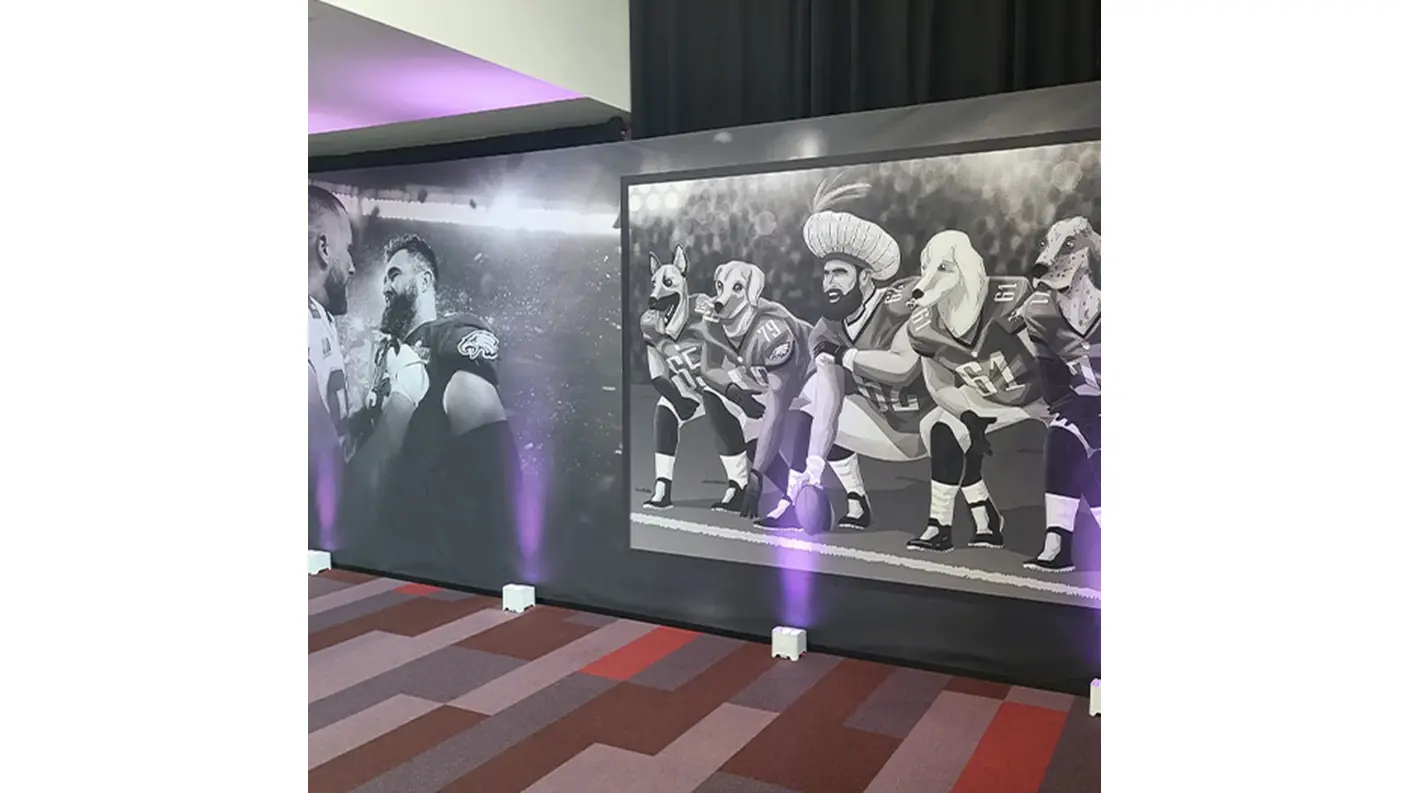 For the world premiere of KELCE—Amazon Prime’s documentary on beloved Eagles icon Jason Kelce—at the Suzanne Roberts Theatre in Philadelphia, we teamed up with our friends at FlyteVu to bring the story to life beyond the screen. Working under a tight timeline, we built, trucked, and installed branded decor that honored Kelce’s grit and hometown pride.