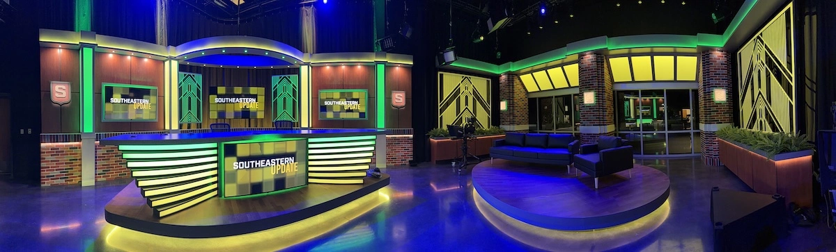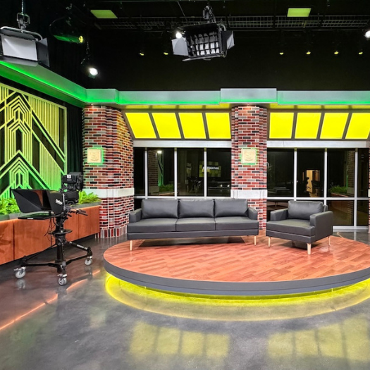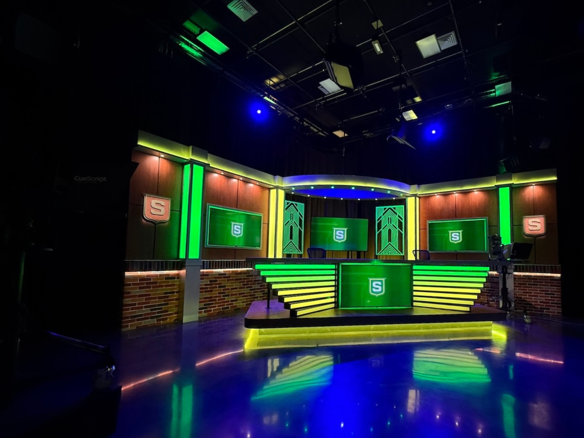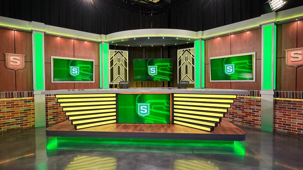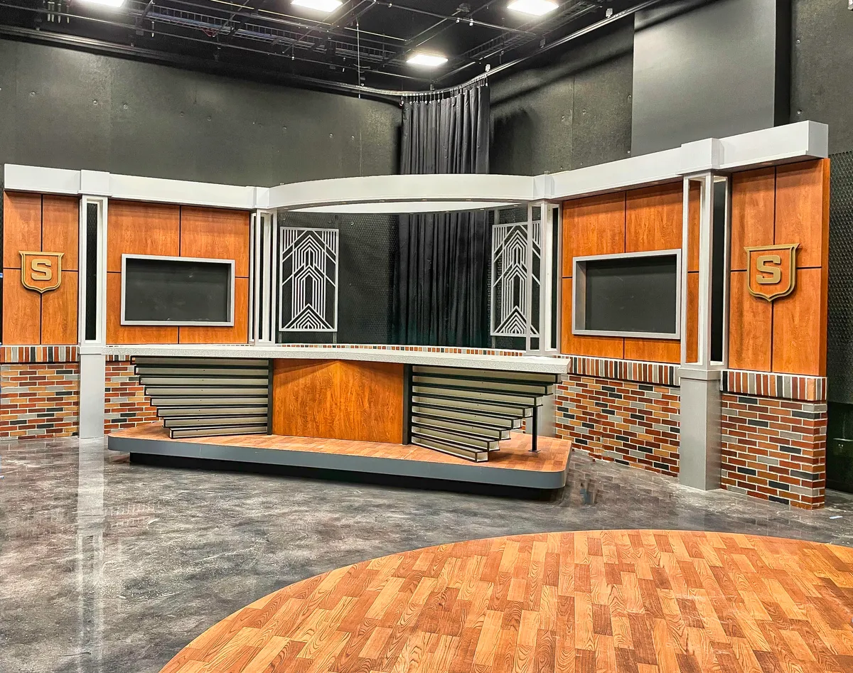 We collaborated with SLU theatre professor Steve Schepker and his talented team to translate their design into a hands-on space built with intention. At the heart of the studio, we installed a raised anchor desk with soft LED lighting, flanked by modular columns of light and a vibrant backdrop made of custom wood panels, integrated screens, and hand-finished faux brickwork that echoes the character of the campus. Nearby, we created a flexible interview area with a round wooden platform, Art Deco-inspired screens, and bold brick-style columns accented by illuminated “S” emblems. A wall of windows offers the option for natural light or a more intimate setup, depending on the tone of the production. Furnishings were selected to move and shift easily, giving students the freedom to experiment and adapt. Every detail was shaped with care to help create a space where young storytellers can explore their voice and their future.
