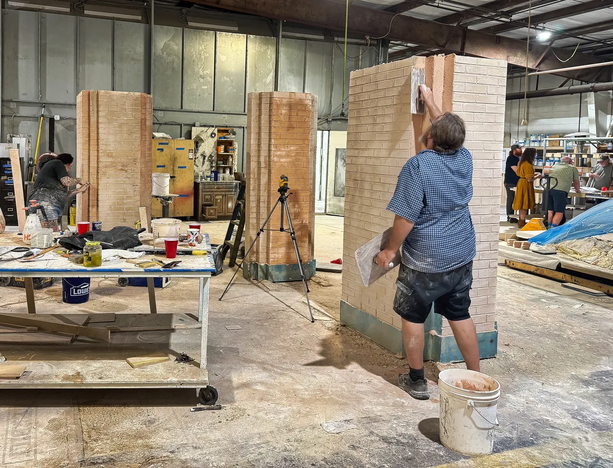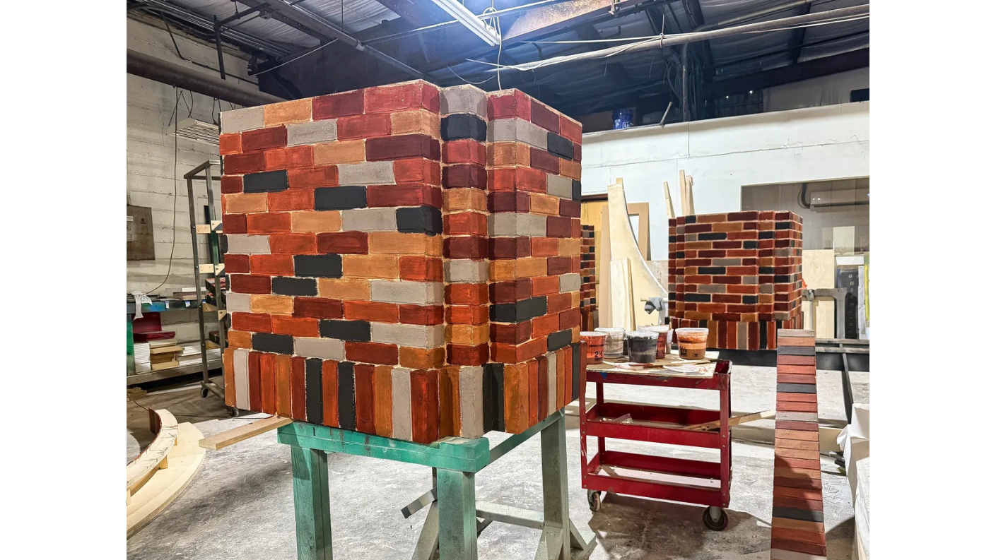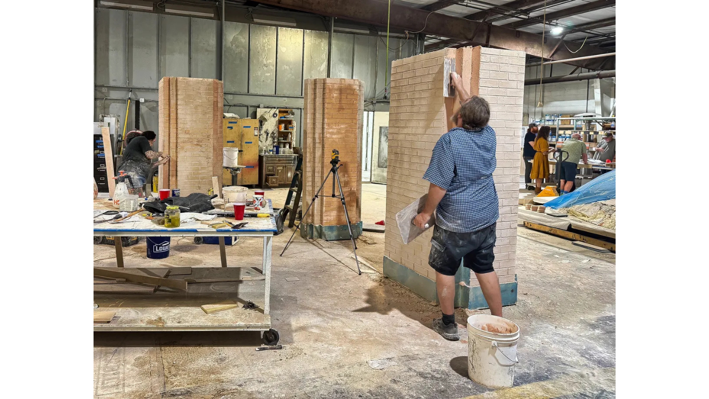 We collaborated with SLU theatre professor Steve Schepker and his talented team to translate their design into a hands-on space built with intention. At the heart of the studio, we installed a raised anchor desk with soft LED lighting, flanked by modular columns of light and a vibrant backdrop made of custom wood panels, integrated screens, and hand-finished faux brickwork that echoes the character of the campus. Nearby, we created a flexible interview area with a round wooden platform, Art Deco-inspired screens, and bold brick-style columns accented by illuminated “S” emblems. A wall of windows offers the option for natural light or a more intimate setup, depending on the tone of the production. Furnishings were selected to move and shift easily, giving students the freedom to experiment and adapt. Every detail was shaped with care to help create a space where young storytellers can explore their voice and their future.