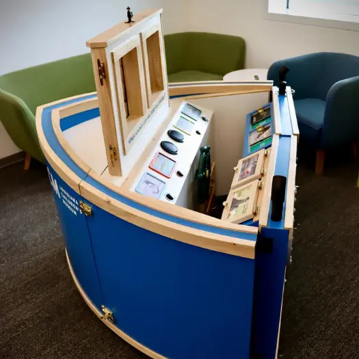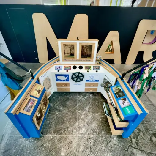The durable, kid-friendly design evokes a classic shrimp boat, complete with a recognizable bow and two foldable sides that extend or collapse for easy setup, breakdown, and shipping. We incorporated tactile learning panels and interactive games that introduce children to wetlands ecology, storm resilience, and the resourcefulness of human and animal adaptations.