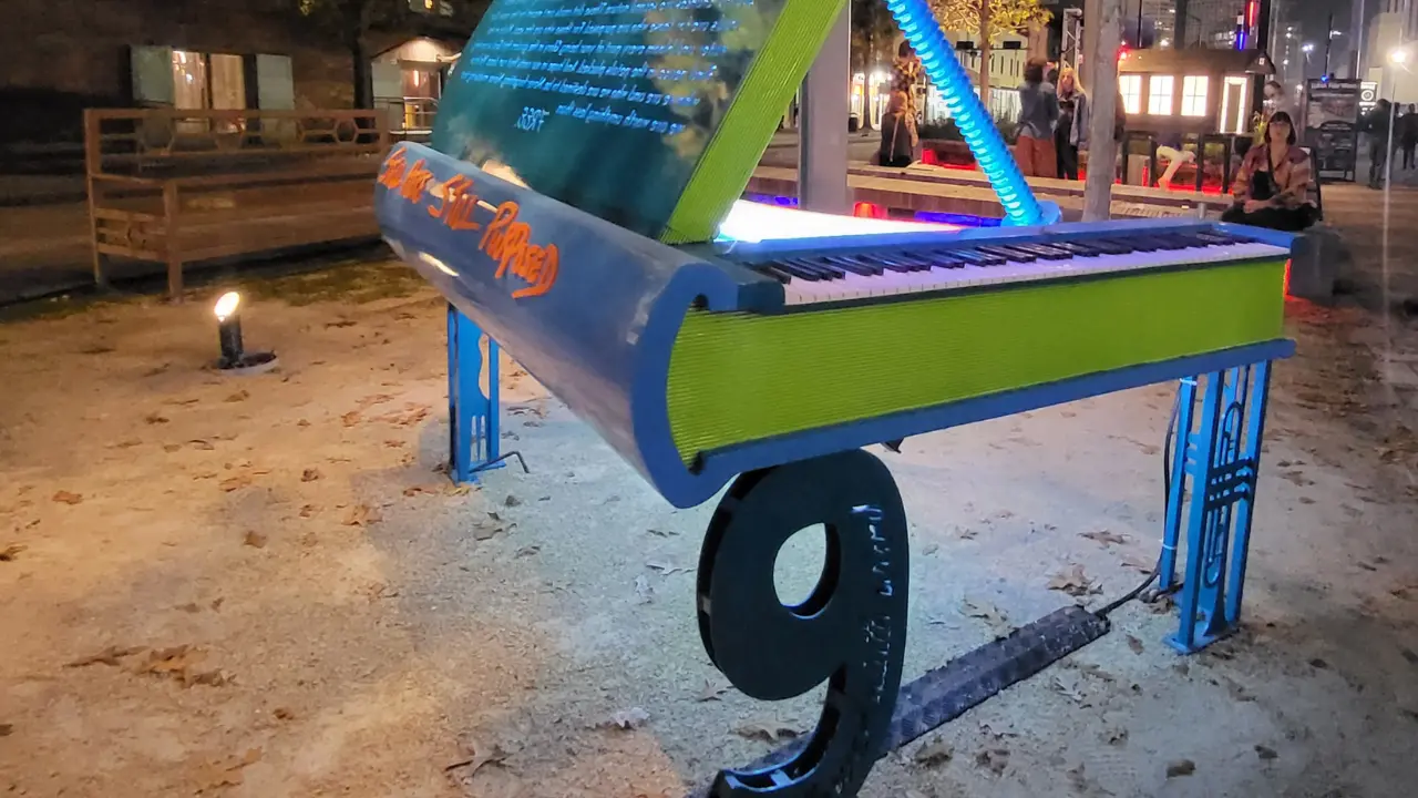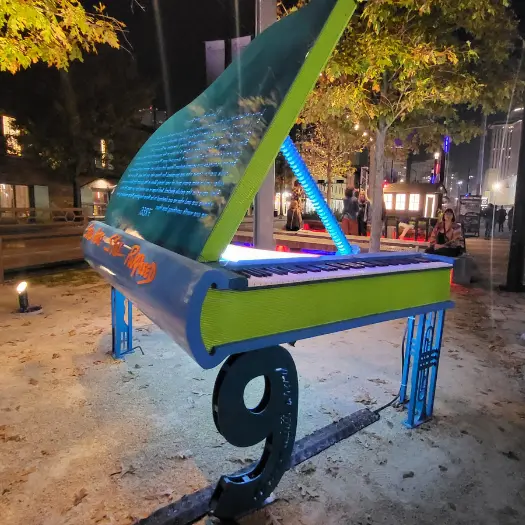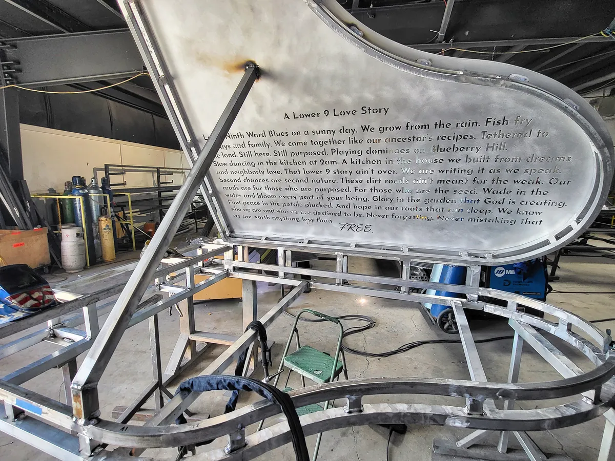 Crafted from CNC-cut steel, the piano is lit interiorly by integrated neon lighting. We custom-machined and welded each component, including the giant sculptural screw that props up the piano lid. The vibrant turquoise and neon green body stands on four uniquely symbolic legs: a trumpet, a fork, a stylized “9” for the neighborhood, and “1852” for the Lower 9's year of incorporation. The book’s spine proudly bears the words “Still Here, Still Purposed” in bold,raised orange lettering, affirming the enduring presence and purpose of the community it honors.