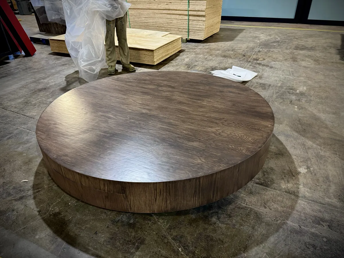 This piece may look simple, but it's got some sneaky engineering under its shiny veneer. We had to build it to be moveable, but rated for half a ton of weight.