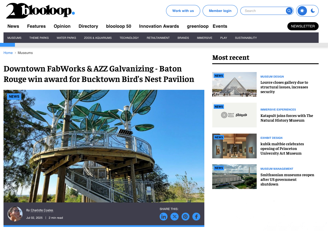 METAIRIE, La. - Downtown FabWorks, a leading provider of turnkey fabrication solutions for creative projects across the attractions industry, has announced that its collaboration with AZZ Galvanizing - Baton Rouge on the Bucktown Bird’s Nest Learning Pavilion has earned top recognition at the 2025 American Galvanizers Association (AGA) Excellence in Hot-Dip Galvanizing Awards.