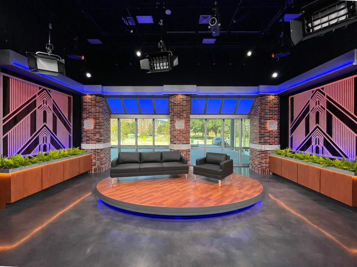 In the tradition of Robin Roberts’ Good Morning America, the interview area boasts a wall of windows looking over Southeastern’s campus. Whether it’s framed by daylight or tucked behind blackout curtains for more intimate lighting, the setup offers students the chance to learn how atmosphere shapes every frame.