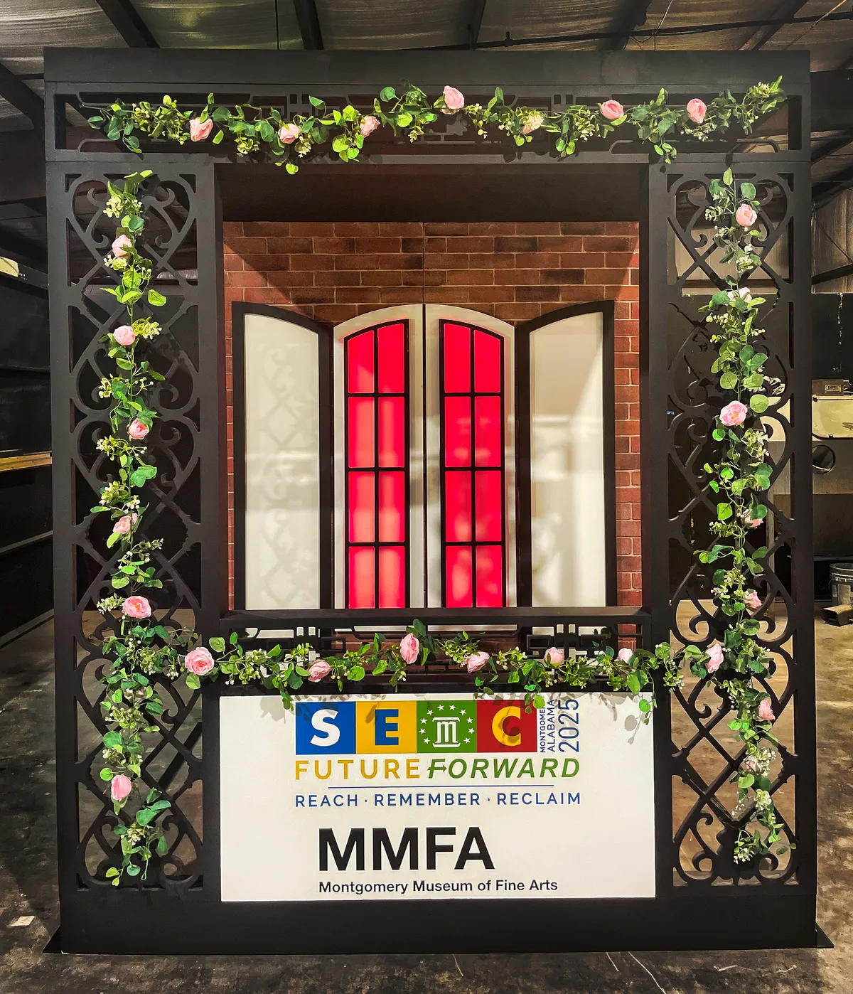 Some projects just keep on giving, and our custom-built step-and-repeat photo booth is one of them. Originally designed for a SiriusXM + Pandora Super Bowl LIX event, this French Quarter–inspired beauty has had a few makeovers since its debut, and it’s about to hit the road again. This time bound for Montgomery, Alabama, and branded for the 2025 Southeastern Museums Conference and the Montgomery Museum of Fine Arts!