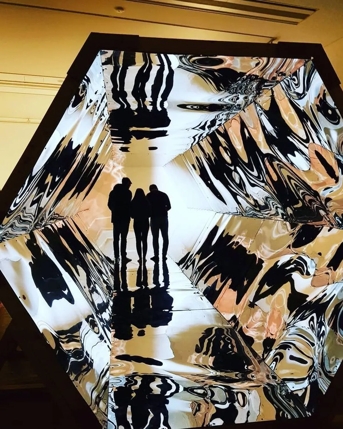 Then comes another piece of kaleidascopic magic: all surfaces not dedicated to the art itself are reflective - an intended function of the art as an experience. Viewers are able to see themselves and the art reflected as one, as fluid within time and space, as all-encompassing.